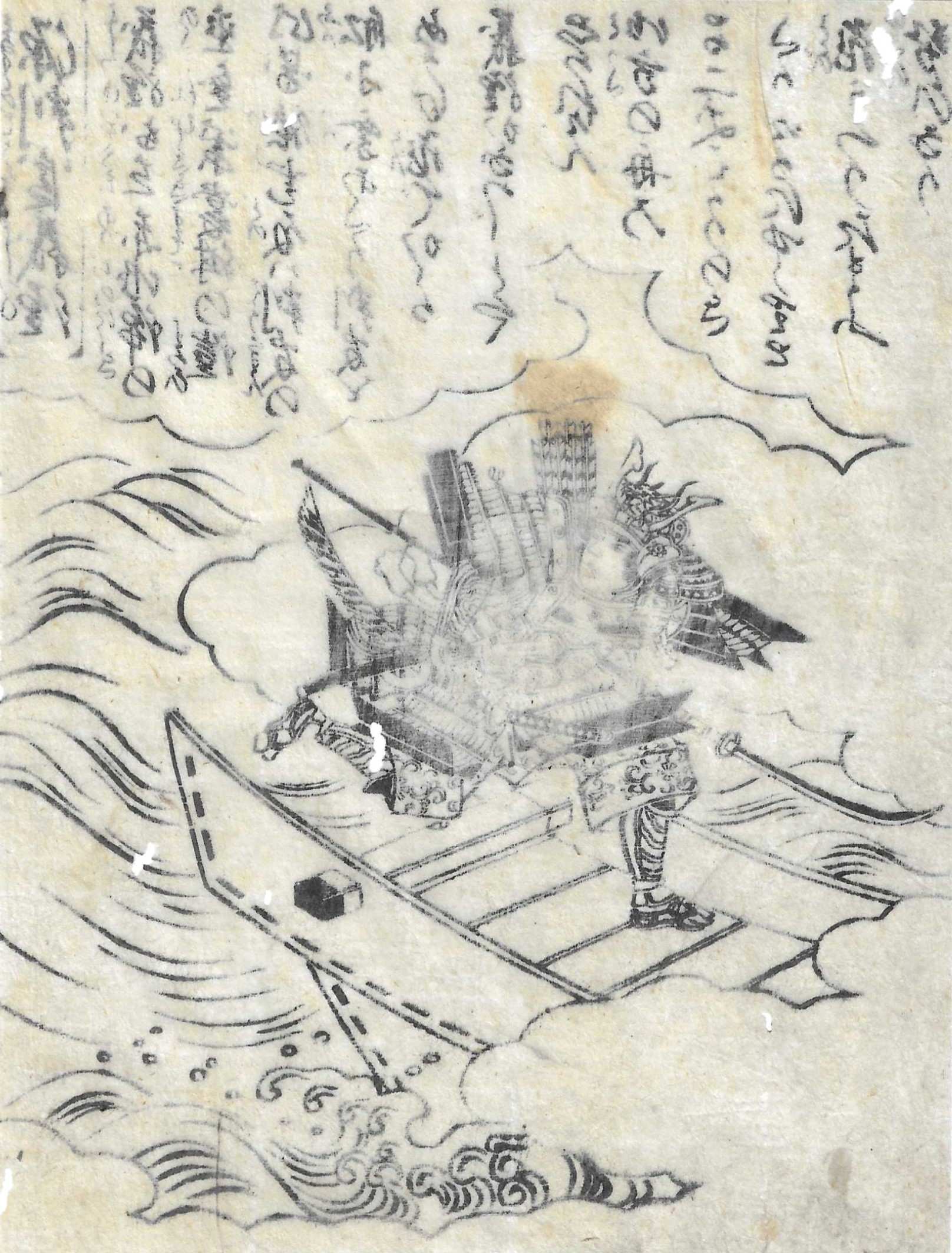 This single sheet probably taken from an illustrated war tale depicts Minamoto no Yoshitsune during his legendary “Eight-Boat Leap,” as he escapes across enemy ships while being pursued by the formidable